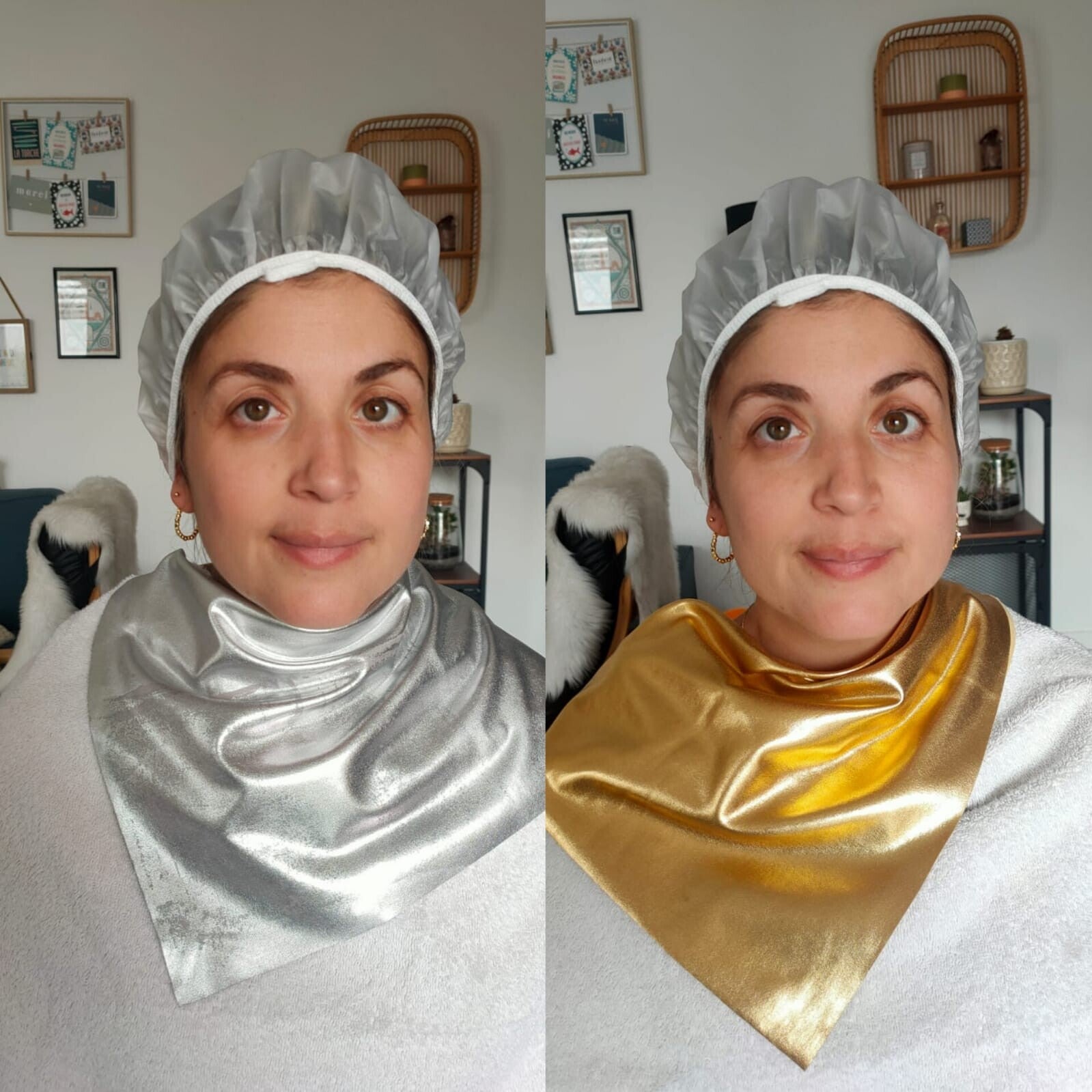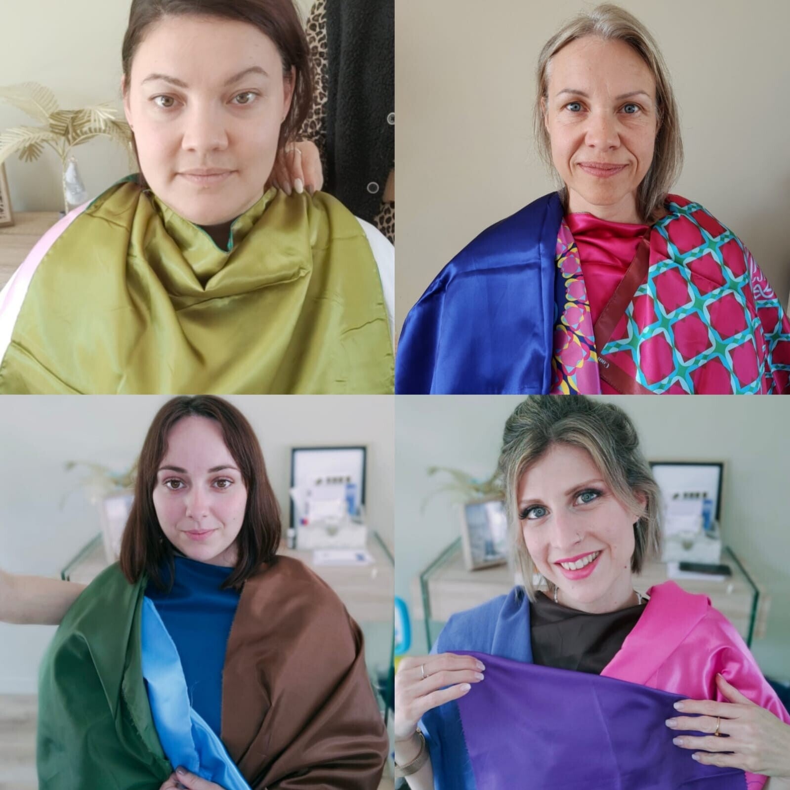 Après un échange qui m'informe sur vos habitudes (maquillage, vestimentaire, capillaire et vos envies), je vous installe face au miroir, sous une lumière neutre et sans maquillage. Je vous habille d'une cape blanche pour que toute l’attention soit portée sur votre visage. Je place ensuite différents drapés de tissus colorés sous le menton : certains font immédiatement briller le teint et pétiller les yeux, tandis que d’autres donnent l’air fatigué ou ternissent la peau.